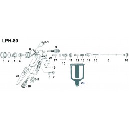 Identifié sous le repère 1 sur le schéma constructeur, ce chapeau air Ø1.2 mm s’adapte parfaitement au pistolet LPH80, garantissant un alignement exact avec l’aiguille et la buse. Le montage est rapide et fiable, pour un résultat constant.